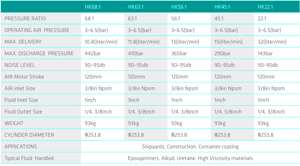 HK series are the most ideal airless pump for rough painting job. This pump can work in construction, cleaning, and container. The best price, and good quality. Typical fluid handled : epoxy, alkyd, polyurethane, special high viscosity Paint.