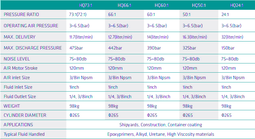 Equipped with large cylinder diameter & plenty of discharge rateconstant and has a longer stroke. » Steady bestseller This paint pump is best seller of our company products because it has high pressure. Mainly used where high pressure is required shipbuilding. » Air filer and oiler attached Equipped with air filter regulator and lubricator for easy air line controlling. Surely, prolong the machine’s lifetime and performance. » Pneumatic big wheels Equipped with pneumatic wheels for easy moving » Prevent hearing loss The muffler is attached to prevent hearing loss, is designed to prevent freezing and pulsation structure.